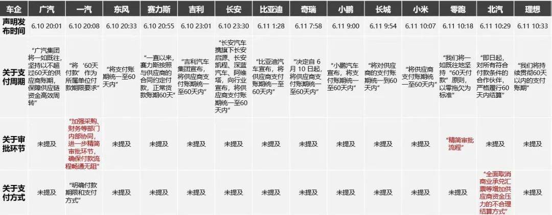 到了第二天,奇瑞、长城、北汽、上汽、江淮全说自己要做到账期 60 天内,还有小米、小鹏、理想、蔚来这些新势力也纷纷响应。