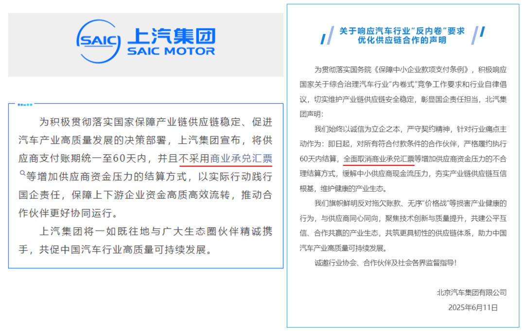 而在车企们的表态里,目前只有北汽和上汽两家,明确提到不用商业承兑汇票。