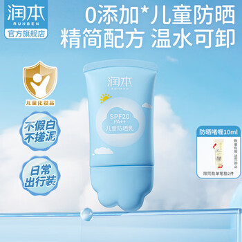 国家药监局认证,3岁+儿童专属,安全无香配方,水包油乳液体系,质地清爽,轻薄不粘腻,SPF20 PA++温和型防晒。目前50mL京东商城润本官方旗舰店售价¥49.9,叠加¥35优惠券,实付新低¥14.9包邮,有需可入