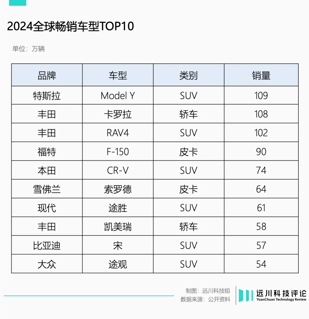 去年全球前十大畅销车型中,有足足六款SUV,两款“美国人的SUV”福特F-150和雪佛兰Silverado,仅有两款轿车,还是史诗级长青车型卡罗拉和凯美瑞。