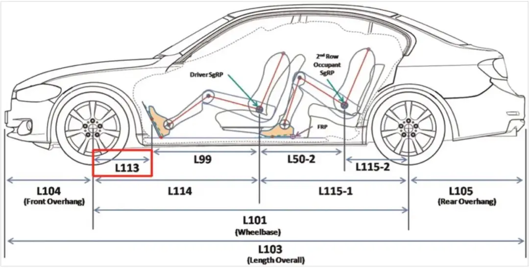 在汽车设计与工程中,一般会用L113这个指标衡量车头长度,定义为前轮轮心到制动踏板的距离(dashto axle)。日常视角看,前门门框与前轮轮心的距离越长,车头就越长。