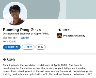 这也是一名华裔,名叫Ruoming Pang,是苹果基础模型团队(Artificial Intelligence Models,AFM)的负责人。