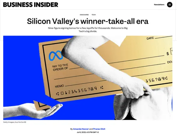 一位前Meta员工透露,随着“顶尖科技人才终于获得了像顶级运动员一样的待遇”,许多科技行业的普通员工充满了怨恨和嫉妒,“尤其是在那些已经在这个行业工作了一段时间的人中。”