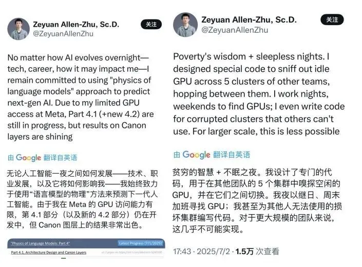 Zeyuan Zhu自己在X上,就多次提到FAIR团队的“GPU访问能力有限”。甚至提到,自己为此设计了专门的代码,“用于在其他团队的5个集群中嗅探空闲的GPU,并在它们之间切换”。