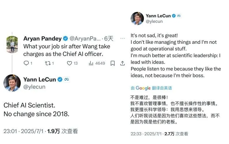 杨立昆有两则回应,一则是强调自己是从2018年起就是首席人工智能科学家,没有变过。一则是表示自己确实不擅长管理,更擅长科学方面的领导。