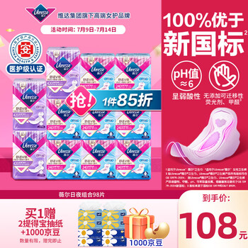 女性每月刚需,还赠得宝得宝mini抽纸80抽*8包+10元京豆(赠品均订单可见)!目前薇尔京东自营旗舰店售价¥128,1件85折,可领取¥43优惠券,首购减¥4,PLUS会员减6.4元,订单完成自动返10元京豆,实付¥45.4包邮,到手240mm*10片*8包+420mm*6片*3包+赠得宝抽纸8包!