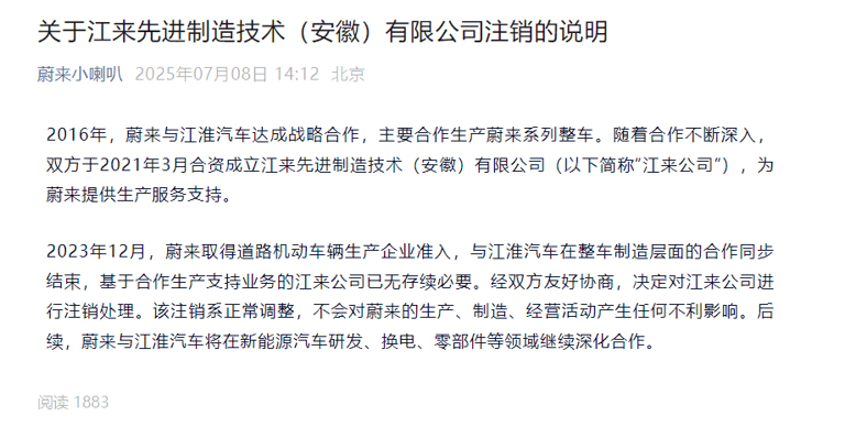 蔚来这边的说法是“正常调整”,不会对蔚来产生不利影响。后续还跟江淮汽车将在新能源汽车研发、换电、零部件等领域深化合作。就比如江淮也有兼容蔚来换电的车型,然后乐道还有一些零部件靠江淮供应啥的。