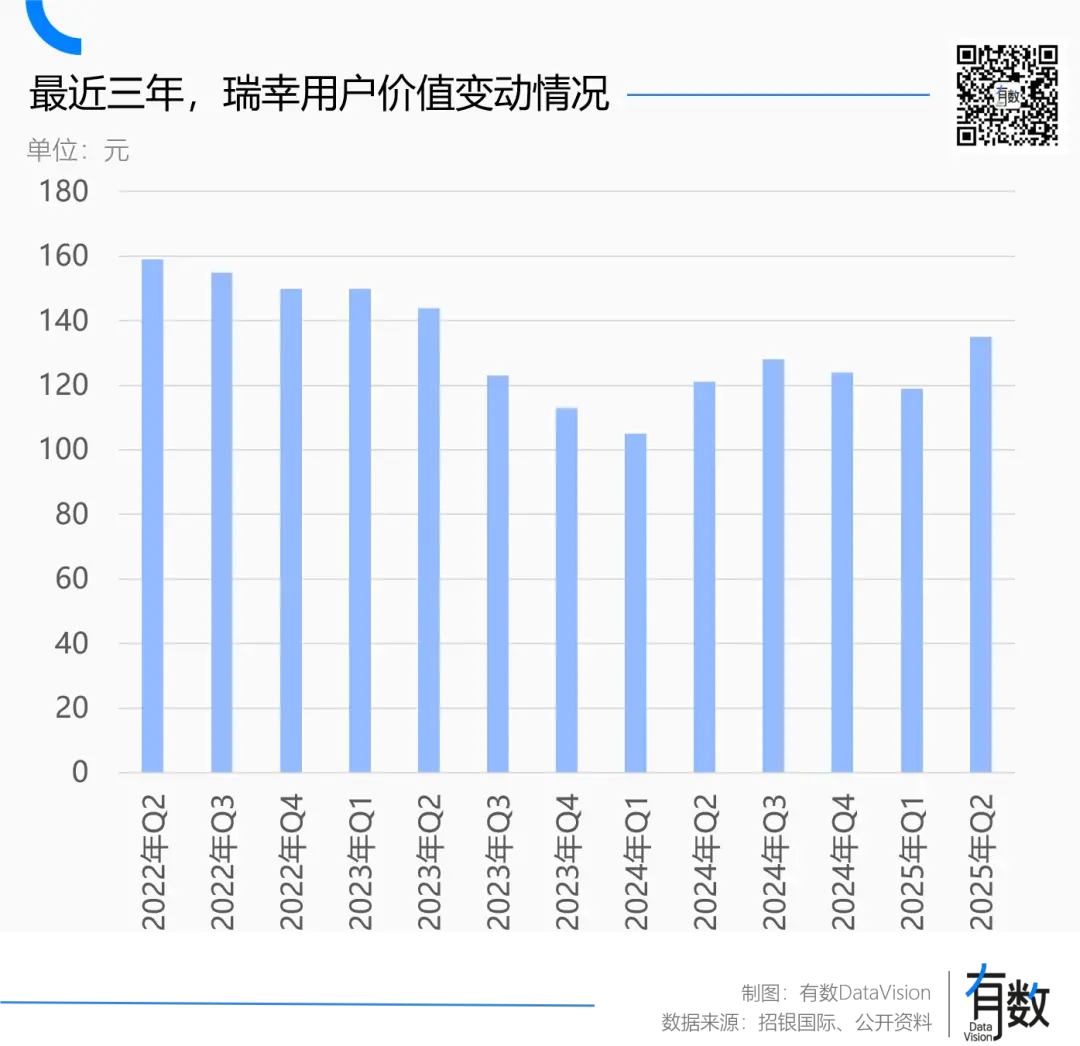 按照招银国际测算,本季度,瑞幸的单用户价值为135元,相比去年同期的121元增长了11.6%。