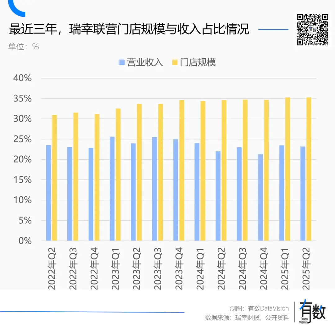 加盟品牌的订单量扩大,虽然客观上也会从品牌那里进更多原材料,但大部分利润留给了加盟商。瑞幸直营门店占比高达65%,订单利润基本都进了自己口袋。