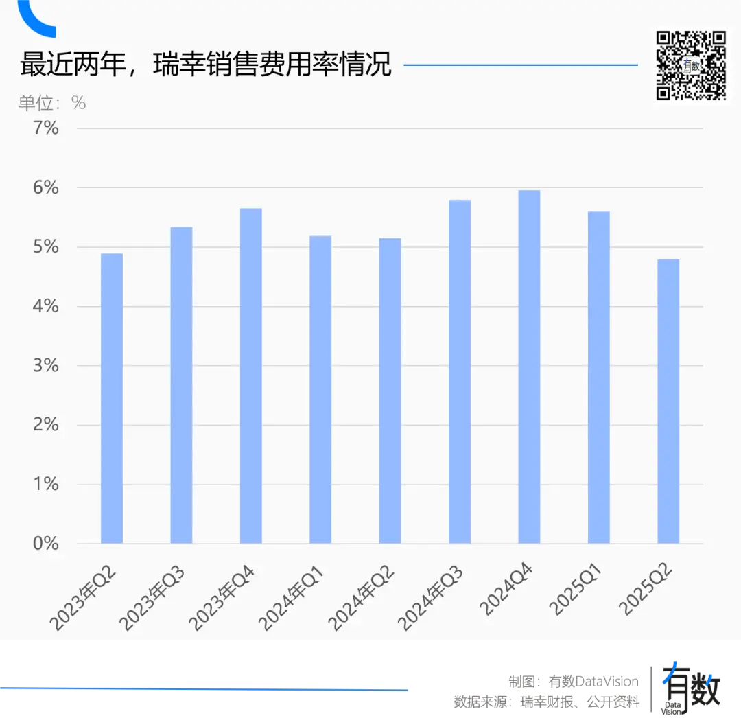 而在新用户和下单频率双双增长的同时,瑞幸几乎没有付出额外的成本,单季销售费用率不升反降,本季度瑞幸销售费用率为4.8%,去年同期为5.1%。