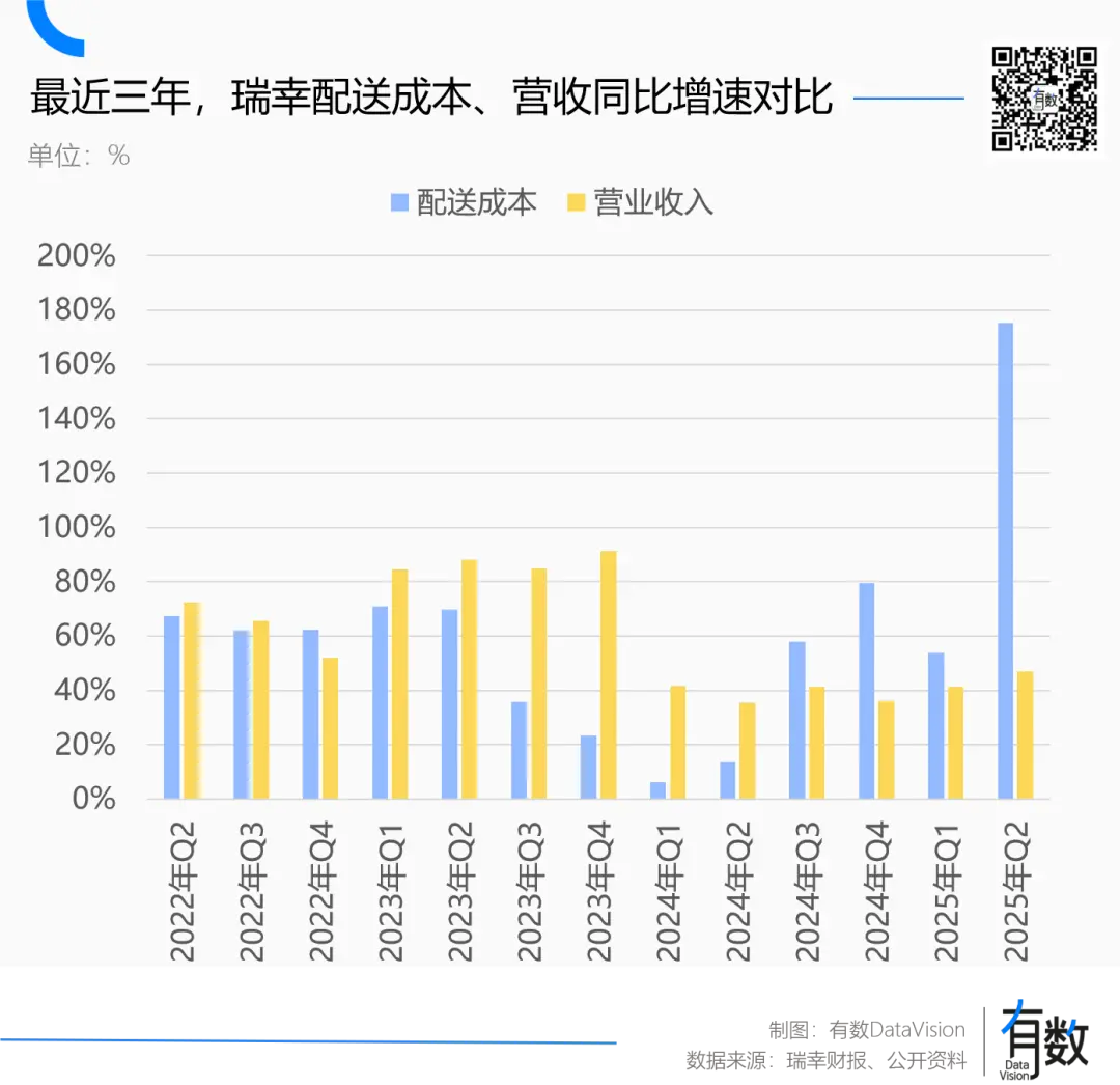与之对应,瑞幸本季营收增幅“仅为”47%,增幅只有配送费的1/4。