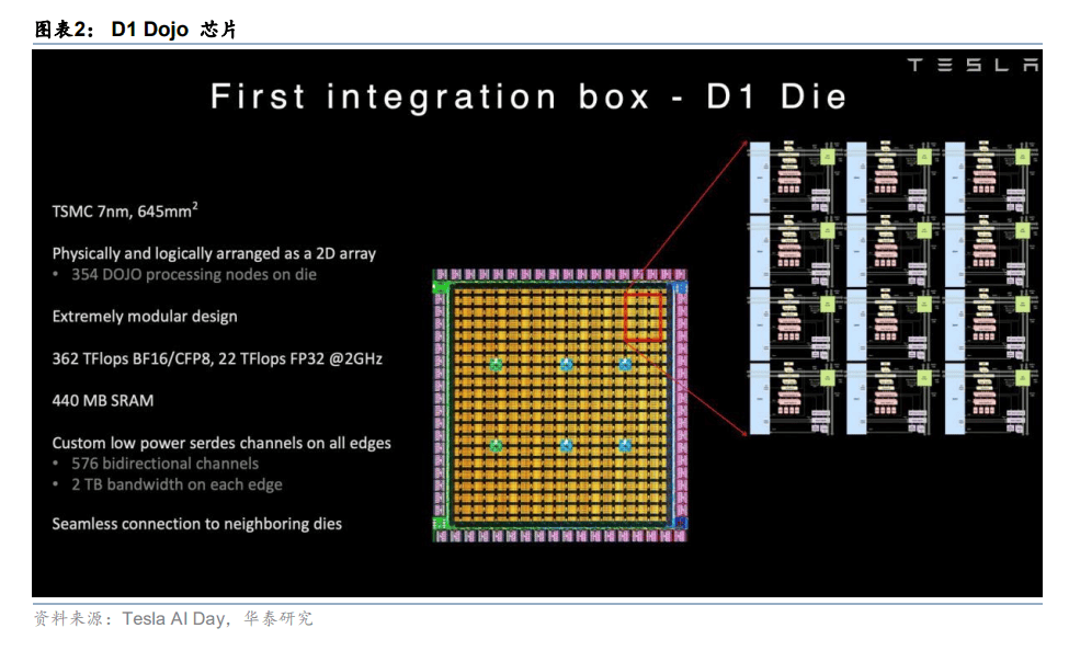 于是在 2019 年,马斯克在特斯拉自动驾驶日上,提出用 Dojo 来训练自动驾驶。随后,在 2021 年的 AI DAY 上,特斯拉就实现了 Dojo 超算的核心——7nm 的 D1 芯片(还是这个老哥)。