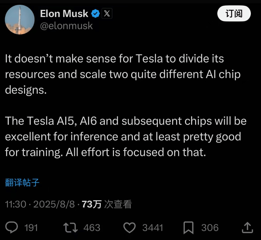 那要问背后原因是啥,老马其实自个儿就发帖说了,这么做主要是因为“ 没有必要分散资源同时开发两种不同 AI芯片 ” 。