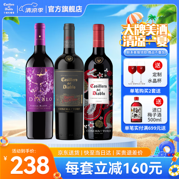 智利进口,干露 红魔鬼 魔尊+尊龙赤霞珠+魔神炫紫限量系列半干葡萄酒 750ml*3支装208元包邮(69.33元/支,赠酒杯*2)