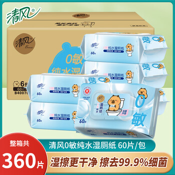 清风 0敏纯水湿厕纸 60片*6包*3件 76.7元包邮(4.26元/包)