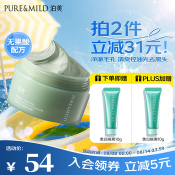 无果酸配方,净澈毛孔,清爽控油光去黑头。目前泊美(Pure&Mild)京东自营旗舰店售价54元,领取52减25元优惠券,官方立减12%,首单礼金5元,,实付低至17.5元,PLUS包邮。