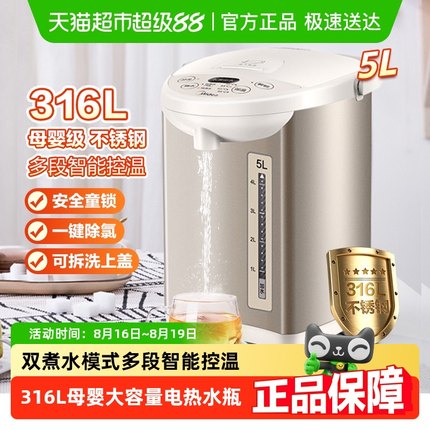 美的全自动智能电热热水壶5L,高颜值恒温电热水壶!智能童锁,触屏按键,304食品级不锈钢,5L黄金容量,多段智能温控,隔热防烫,三重断电保护防干烧,让你爱上喝水!