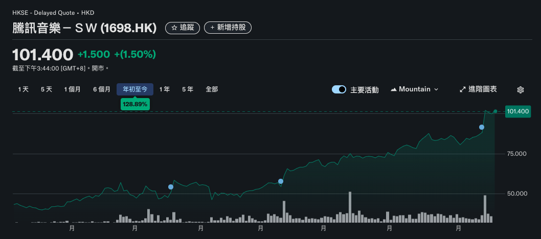 从年初到现在,腾讯音乐的股价一路走高,涨幅都超过了125%。
