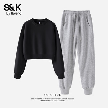 闭眼买:班尼路 系列运动套装简约时尚收脚裤两件装 黑#纯色+灰#纯色 59.9元