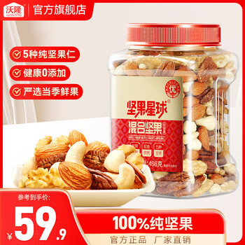 5种纯坚果混合装,不添加葡萄干!京东沃隆官方旗舰店售价99.9元,参与满99元减20元,领取满99-20元优惠券,满99-20元优惠券,下单1件,实付低至39.9元,之前要2罐才能做到这个价,这次1罐就可以了!