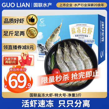 国联水产 国产盐冻大虾南美白对虾 特大号30-40/kg 净重3斤62.12元包邮(20.72元/斤)