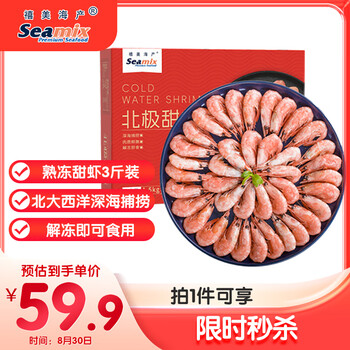 禧美海产 MSC认证 加拿大北极甜虾 净重3斤 150/180规格53.03元包邮(17.68元/斤)