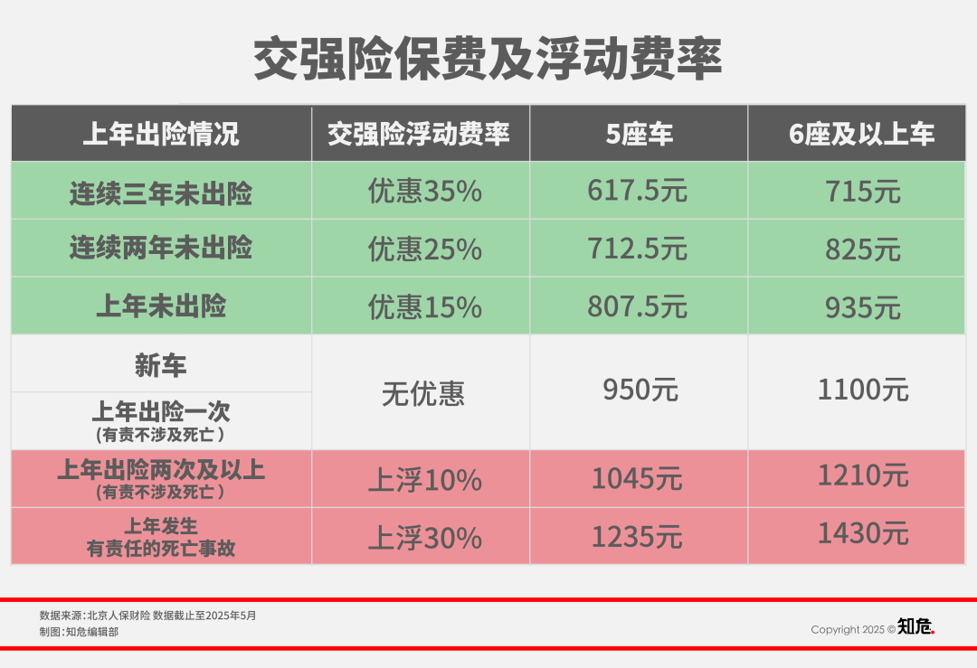 其中, 基础保费对于同一类型车型都是全国统一的。比如,家庭自用 6 座以下汽车基础保费为 950 元,6 座以上为 1100 元。形成交强险最终保费区别的还是在于浮动费率,即承保车辆是 否发生过道路交通事故,是否产生过交通安全违法行为。