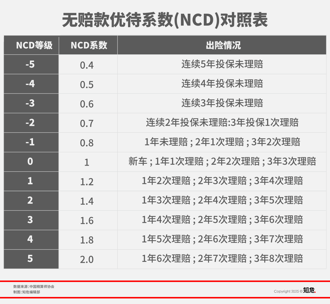 在这个公式中,无赔款优待系数 ( NCD 系数,no-claim discount )是商业险中为数不多与车主驾驶行为直 接挂钩的变量。该系数基于车辆历史出险记录动态调整保费的奖惩机制,不同保险公司执行统一标准,旨在通过 “ 奖优罚劣 ” 实行风险与成本匹配。