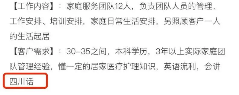 比如,一看这个家的主人就是四川人,因此除了基本条件还要求阿姨会说四川话