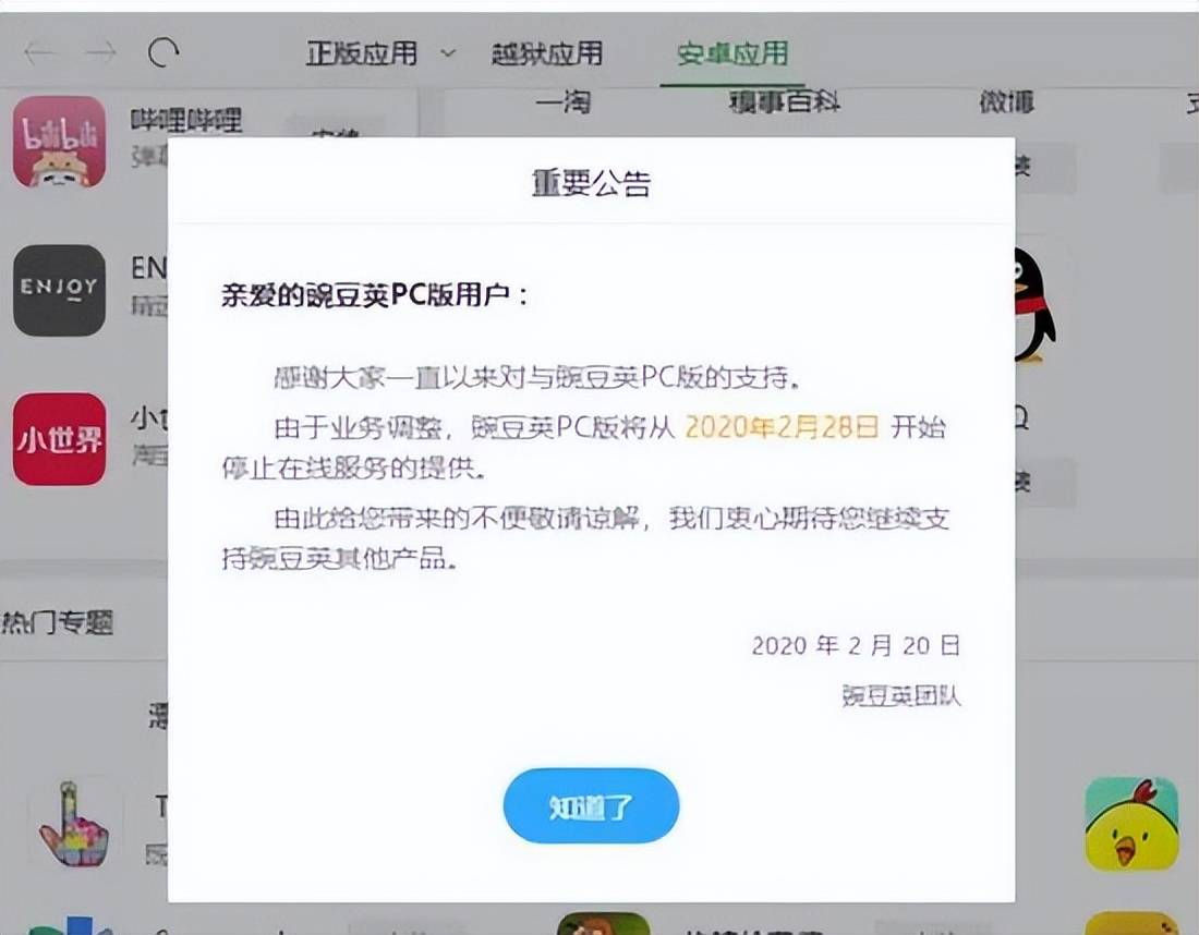 同样的,2017 年豌豆荚 PC 版被战略性放弃,并入阿里应用分发。到了 2020 年 2 月,豌豆荚 PC 版和PP 助手 iOS 版彻底停止服务。
