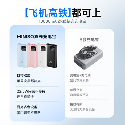 国家3C认证,名创优品 自带线移动电源充电宝 10000mAh 4色 券后63.9元包邮