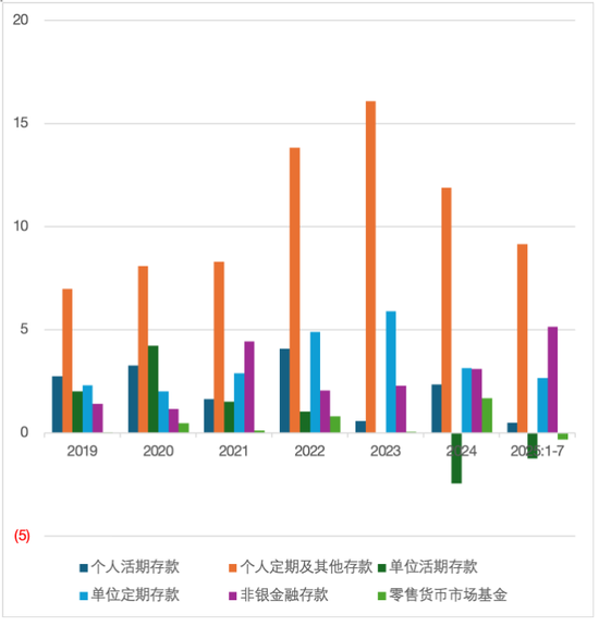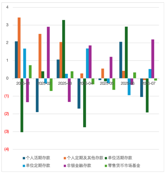 如果希望观察更高频的数据,则可以使用2025年各月度的存款各细项增量(单位:万亿元):