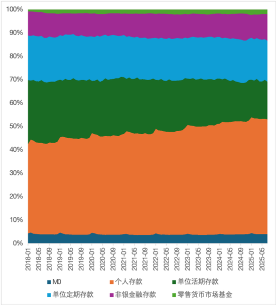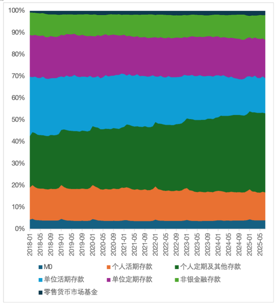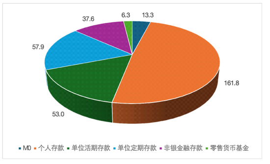 基于人民银行披露的数据,截止2025年7月末,我国M2总规模是330万亿元,其结构为(单位:万亿元):