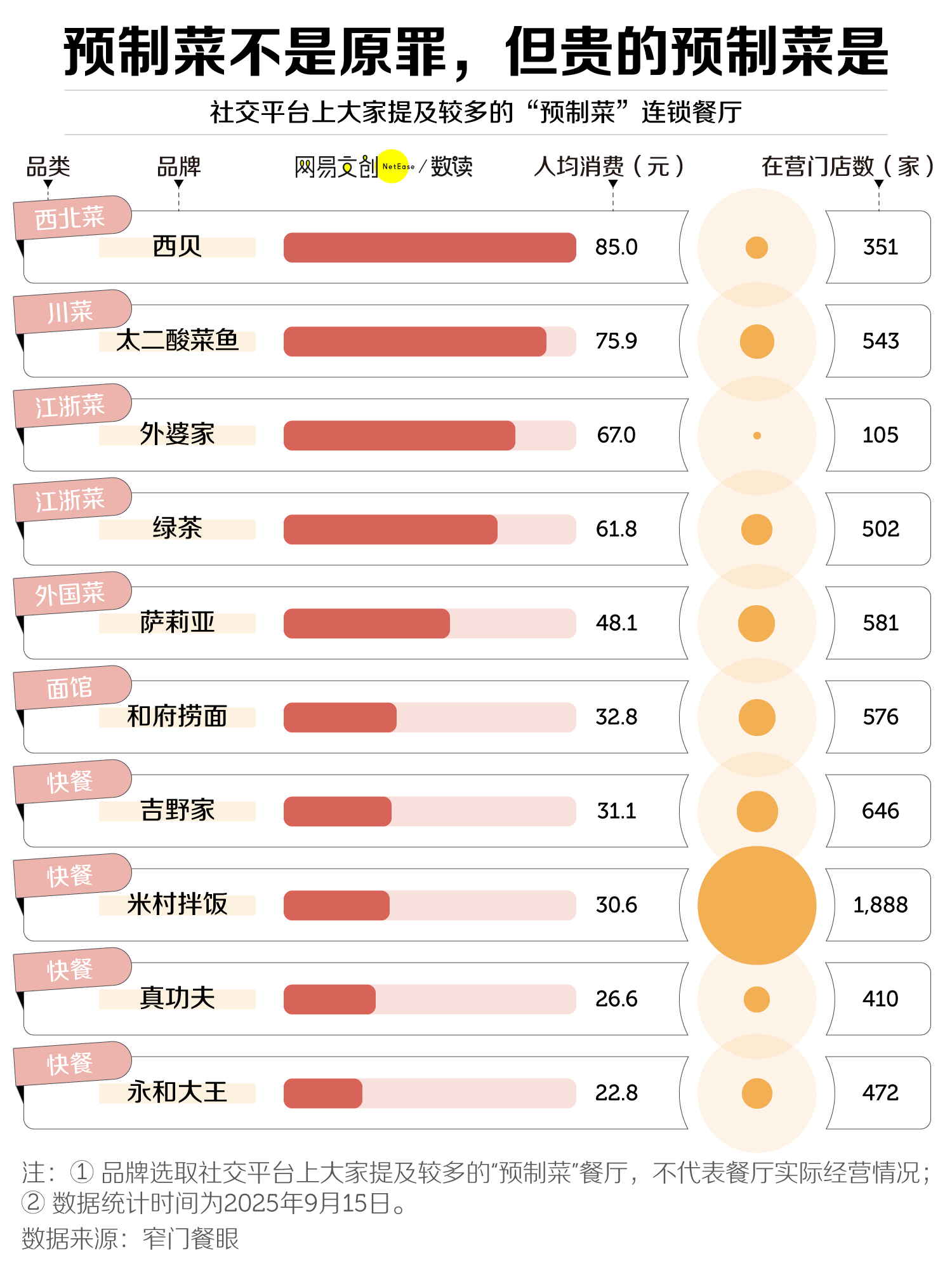 社交平台上被频繁点名、人均消费 60 元以上的连锁品牌,几乎都绕不开“预制菜”争议,像西贝 85 元、太二酸菜鱼 75.9 元……有时候“忍着肉痛”想多点几个荤菜犒劳自己,大概率得一百好几。