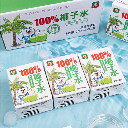 折合¥2.35/瓶囤货好价!椰水原汁含量100%,非浓缩还原,富含电解质。目前200mL*12盒天猫商城佳果源旗舰店售价¥59.9,限时直降¥25,自动弹窗领取¥1.31淘礼金及¥2优惠券,APP端下单下拉至详情页面淘金币限时补贴处点击购买,实付¥28.18包邮,折¥2.35/盒低价!