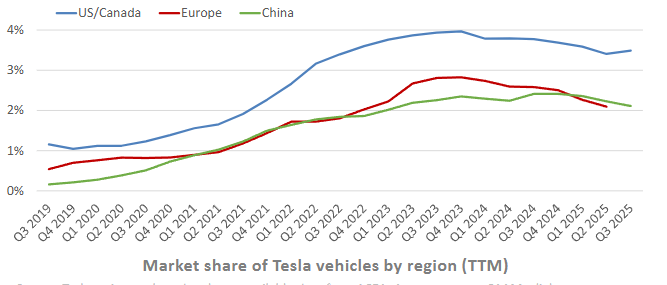 其实在欧洲,特斯拉的销量是有往下掉,但整体上被其他市场拉了起来。