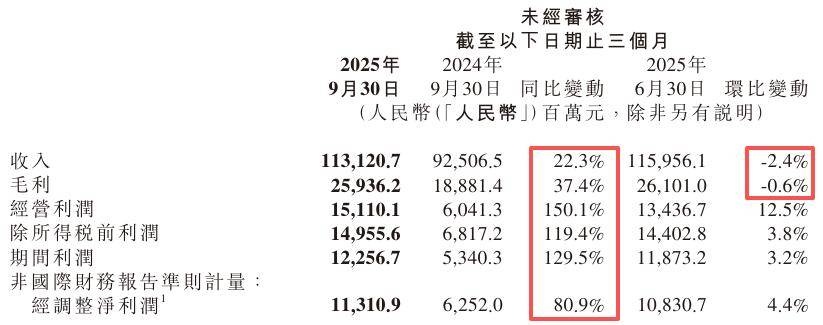 第三季度收入1131亿,毛利润259亿,经调整净利润113亿。