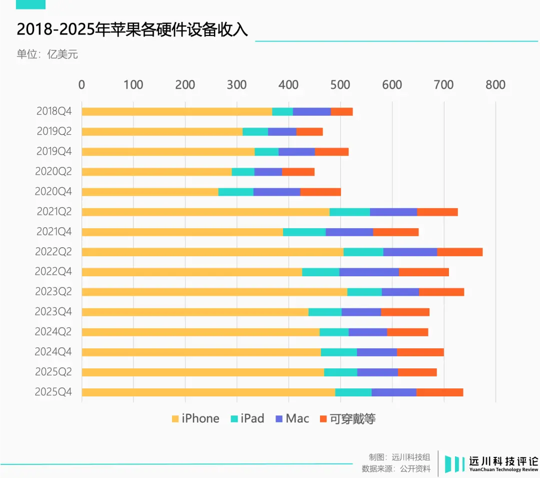 一是iPhone/Mac/iPad三大产品线,是苹果硬件收入的绝对主力。虽然库克在任期内和发布了一系列新产品,但占整体硬件收入比重从未超过10%。