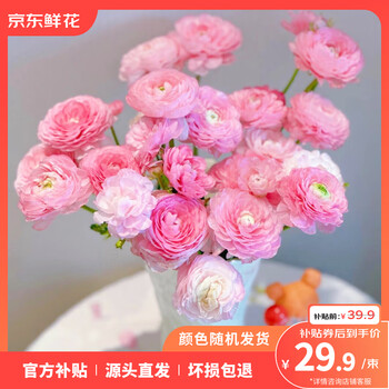 洋牡丹别名波斯毛茛、芹菜花、陆莲花,耐寒喜凉,正好适合现在插瓶观赏。目前京东鲜花自营专区售价39.9元,可领取10元优惠券,到手价29.9元包邮,到手20支,发随机色