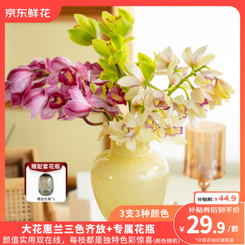 较为热门的国兰之一,清新幽雅、超凡脱俗,自带幽香,正好适合现在插瓶观赏。目前京东鲜花自营专区售价44.9元,可领取15元优惠券,到手价29.9元包邮,赠送花瓶。京东自营发货,售后也有保障。发3枝3色,瓶插期11-15天左右。