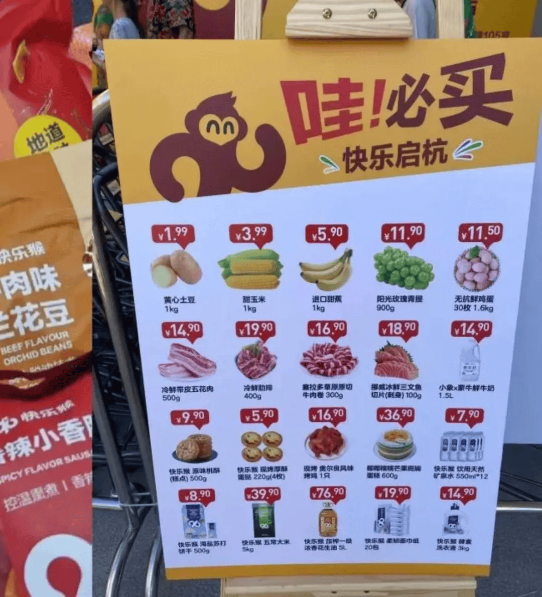 盒马 NB 就像一个“ 砍一刀 ”的盒马。主打的就是一个便宜,1.8 的可乐、9.9 的抽纸 ( 8包 ),7.9 的鲜牛奶 ( 1L ),让路过的男女老少们都服了。