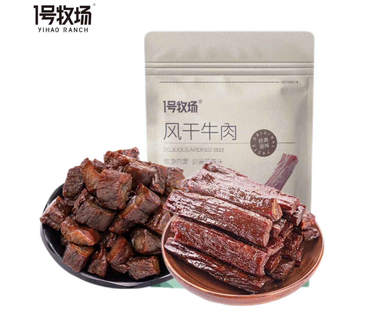 1号牧场 风干牛肉干,大草原天然放养黄牛,甄选黄金大米龙部位,1头牛仅约5%可取,蛋白质含量高达67%,3斤鲜牛肉可做成一斤风干牛肉,肉质紧实,自热风干,独立包装。