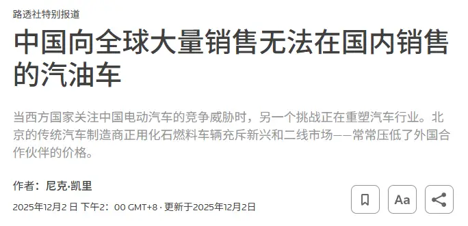 兄弟们,最近外媒盯上咱们的油车了。路透社说,中国出口海外的油车,在中国以外市场变得越来越强势。