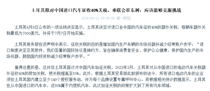 北美后花园墨西哥也同样在 2024 年提高了部分车型关税。土耳其之前也宣布,对所有中国进口汽车(包括燃油车)加征 40% 的额外关税。