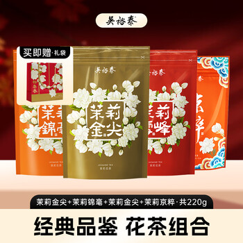 内含零售价¥350/斤的茉莉金尖!超划算的尝鲜组合,一次尝遍4种茉莉花茶~目前天猫商城吴裕泰官方旗舰店吴裕泰旗舰店售价99.9元,立减12%,领取满59减15元优惠券,实付72.9元包邮,内含茉莉金尖50g、茉莉雪峰50g、茉莉锦毫50g、茉莉京粹70g。