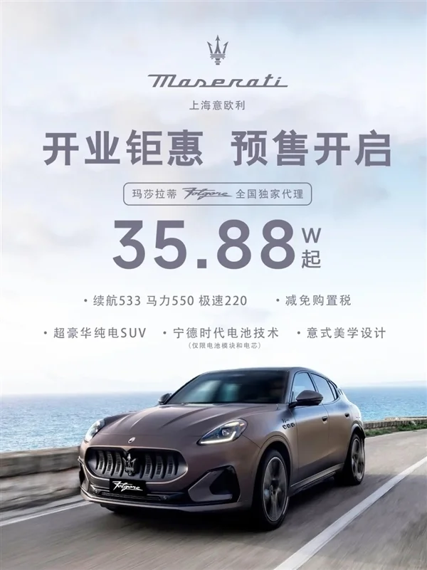 多地经销商推出库存清仓活动,其纯电SUV车型Grecale Folgore裸车价低至35.88万起,而该车型原价为89.88万元,降幅显著。