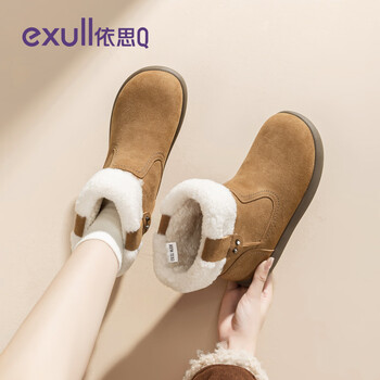 依思 Q 女士毛毛雪地靴2025冬季新款 加绒保暖短靴 驼色 79.99元