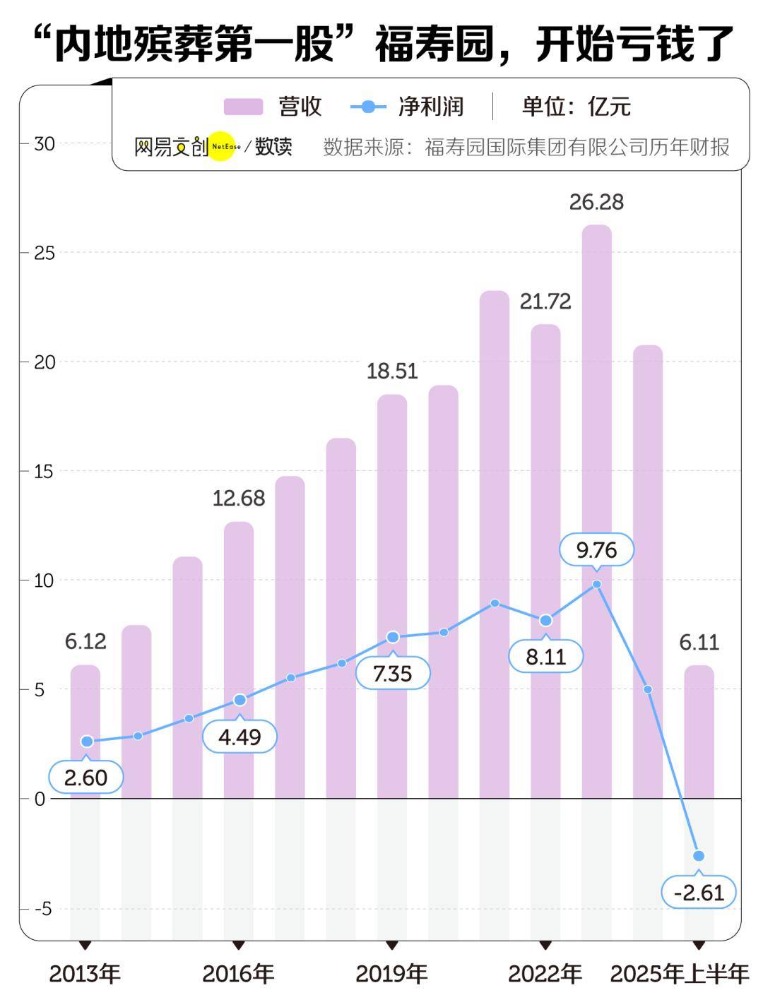 但从那之后,福寿园的业绩就急转直下,2024 年营收下滑, 2025 上半年营收同比继续减少约 44.5%,净亏损 2.61 亿元,成为上市以来的首次亏损。