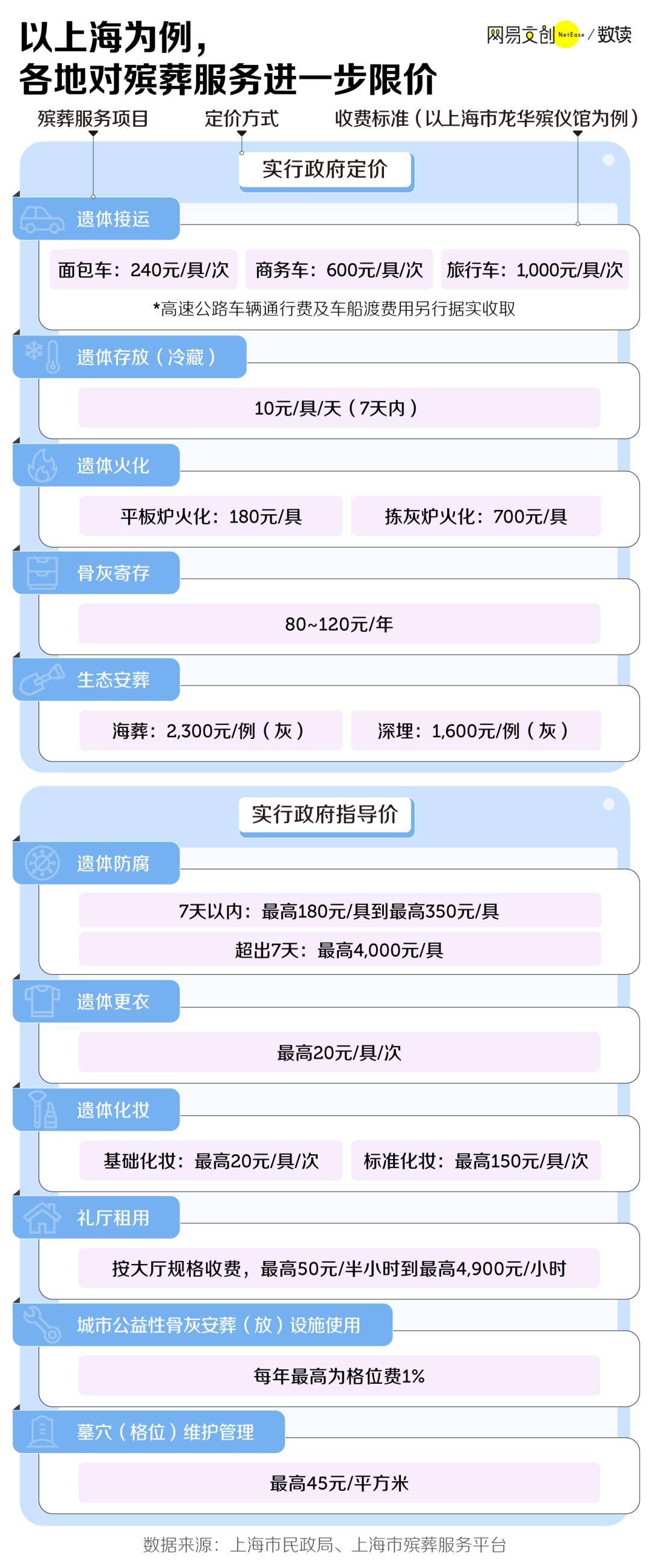 像是墓穴维护管理,最高只能每平方米 45 元,公益骨灰安放设施使用费每年不能超过格位费的 1%。还有过去在上海,每具遗体化妆费基本 500 元起步,现在最高被限制在了 150 元以内。