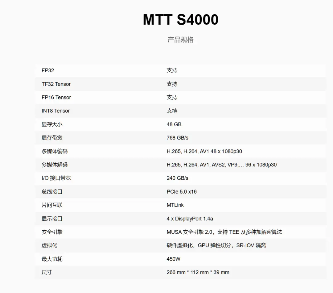 算力卡这边,摩尔线程旗舰S5000的参数表现还不错,由于算力卡更重视性能指标,算是英伟达H100的替代。摩尔线程在带宽、显存、算力表现都不错,支持主流计算精度,这代表着已经可以应用于AI大模型推训了。